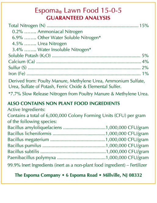 Espoma Lawn Food is the ultimate all-purpose lawn food for any season! It’s a rich blend of natural organic ingredients that is fortified with synthetic ingredients so that it covers larger lawns. It provides slow-release nitrogen to promote a thicker lawn with more vigorous growth. We also add non-staining iron and Bio-tone® microbes to biologically enhance the fertilizer for superior results. Like all Espoma products, no sludges or fillers are ever used. And because it’s made in our state-of-the-art solar powered manufacturing facility, consistency and quality are guaranteed.