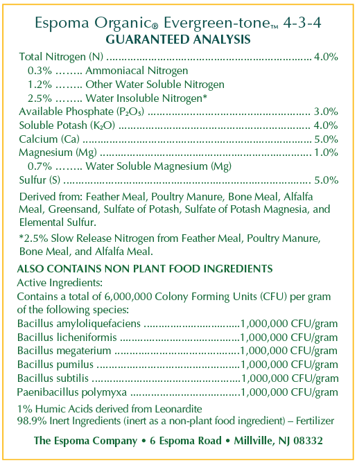 New Plants: When preparing new soil for plants, mix 2 cups of Evergreen-tone per cubic foot of soil (1.5 tbsp. per quart.)