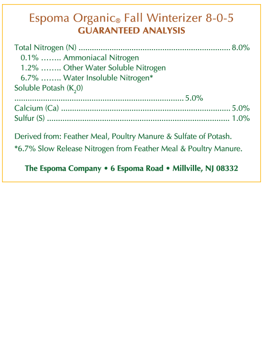 Espoma Organic Fall Winterizer is the ultimate lawn food for Fall winterizing! It’s a rich blend of the finest natural & organic ingredients enhanced with extra potassium to help lawns recover from Summer heat & drought stress. Like all Espoma Organic products, no sludges or fillers are ever used. And because it’s made in our state-of-the-art solar powered manufacturing facility, consistency and quality are guaranteed.