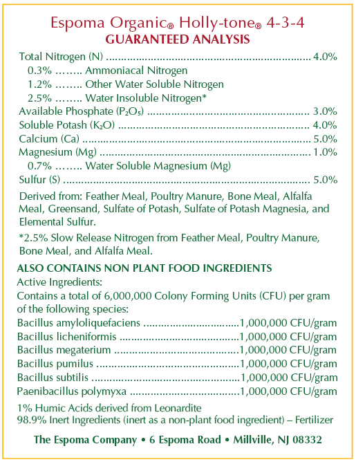 New Plants: When preparing new soil for plants, mix 2 cups of Holly-tone per cubic foot of soil (1.5 tbsp. per quart.)