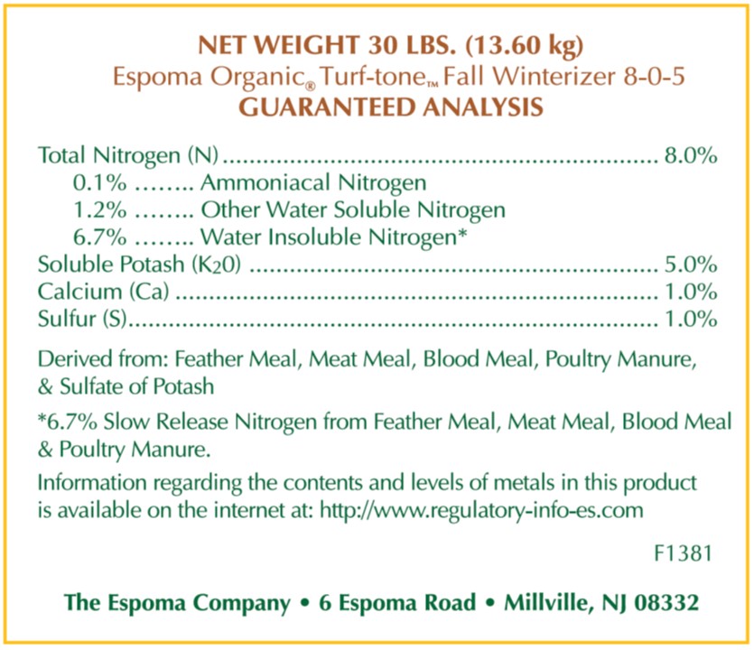 Turf-tone™ Fall Winterizer is the ultimate lawn food for Fall winterizing! It’s a rich blend of the finest natural & organic ingredients enhanced with extra potassium to help lawns recover from Summer heat & drought stress. Like all Espoma Organic products, no sludges or fillers are ever used. And because it’s made in our state-of-the-art solar powered manufacturing facility, consistency and quality are guaranteed.